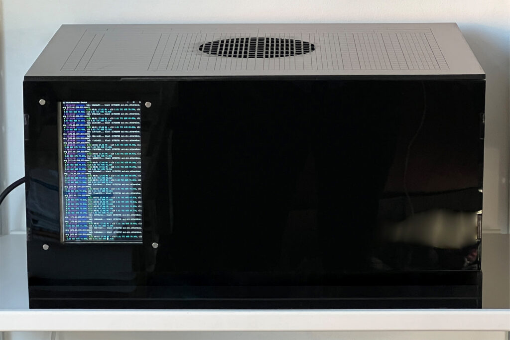 The Final Miner is a black acrylic enclosure for a computer designed to mine the ethereum (ETH) cryptocurrency. This sculpture was installed and activated in late August 2022 to run proof-of-work verifications on the ETH network – a computationally and energy intensive process. The writing of blocks to a decentralized ledger is the proof of work, which is rewarded with cryptocurrency tokens, with the proceeds, in the case of Final Miner, going to the virtual wallet of Enxuto and Love.